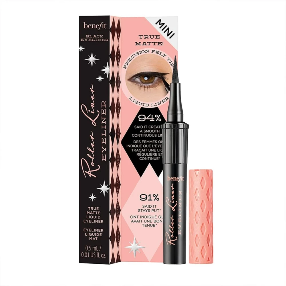 Benefit Roller Liner Eyeliner Glijdt een natuurlijk ogende, fijne lijn aan met de Roller Liner! Onze matte vloeibare eyeliner heeft een precisieviltpunt voor scherpe gecontroleerde lijnen en een supergladde applicatie die niet sleept. De sneldrogende, waterdichte* formule gaat 24 uur mee**. Het vervaagt, schilfert of vlekt niet, dus je kunt de hele dag en nacht genieten van de goede tijden!94% zei dat het een vloeiende doorlopende lijn creëert***93% zei dat het niet aan de huid trekt o