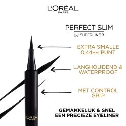 Lu0027Oréal Superliner Perfect Slim Eyeliner BlauwL’Oréal Paris Superliner Perfect Slim Navy is een eyeliner met een fijn stiftje en een intense kleur die de hele dag blijft, zonder uit te lopen of af te bladderen. De vloeibare formule en de precieze applicator zorgen ervoor een gemakkelijk en ultra fijn lijntje te tekenen.Superliner Perfect Slim Navy is een ultra-fijne vloeibare eyeliner voor een intense lookStiftapplicator met 0.4mm fijn puntje en control grip zone dat zor