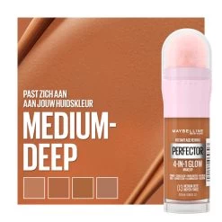Maybelline New York – Instant Age Rewind Perfector 4-in-1 Glow Medium Deep Heeft een lichte formule die de voordelen van 4 producten combineert: vervaagt, concealt, accentueerd en egaliseert de huid in één simpele stap. Beschikbaar in 7 shades die zich aanpassen aan je huidskleur. De revolutionaire lichte vegan* formule die de huid vervaagt, concealt, accentueert en egaliseert met een lichte dekking Door de ingebouwde sponsapplicator breng je het product super gemakkelijk aan Verkrijgbaa